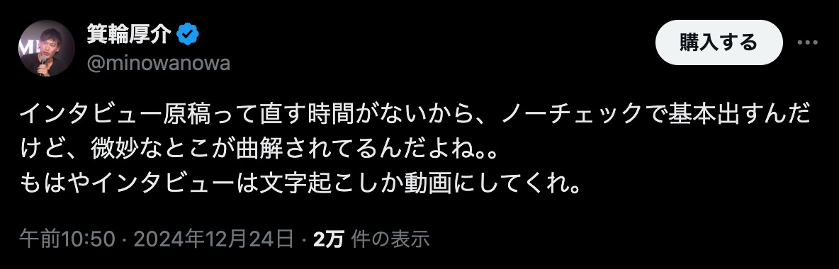 箕輪さんのこの投稿を見ていろいろ考えてしまった。ライターの原稿が曲解されるから、執筆してないただの文字起こしか動画がいいってことですよね。こう言われてしまうとライターの敗北だと思う。