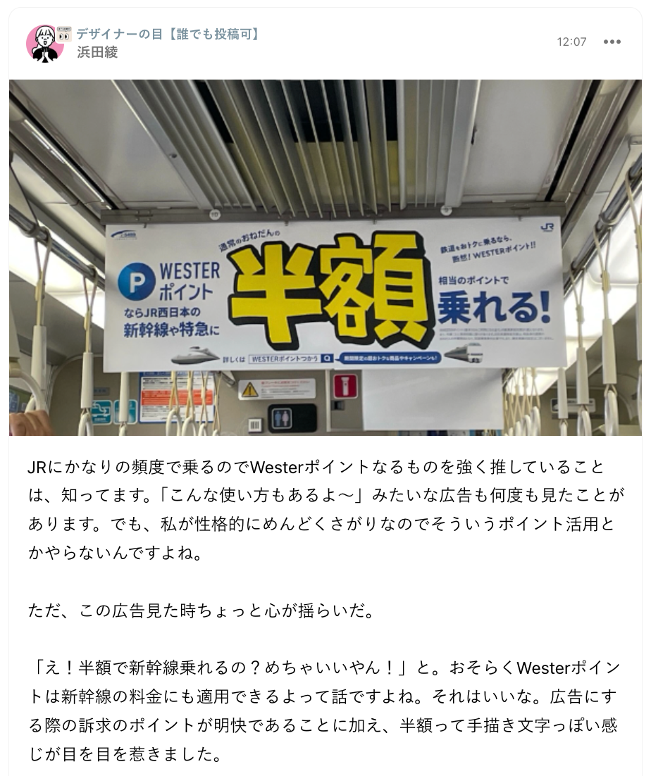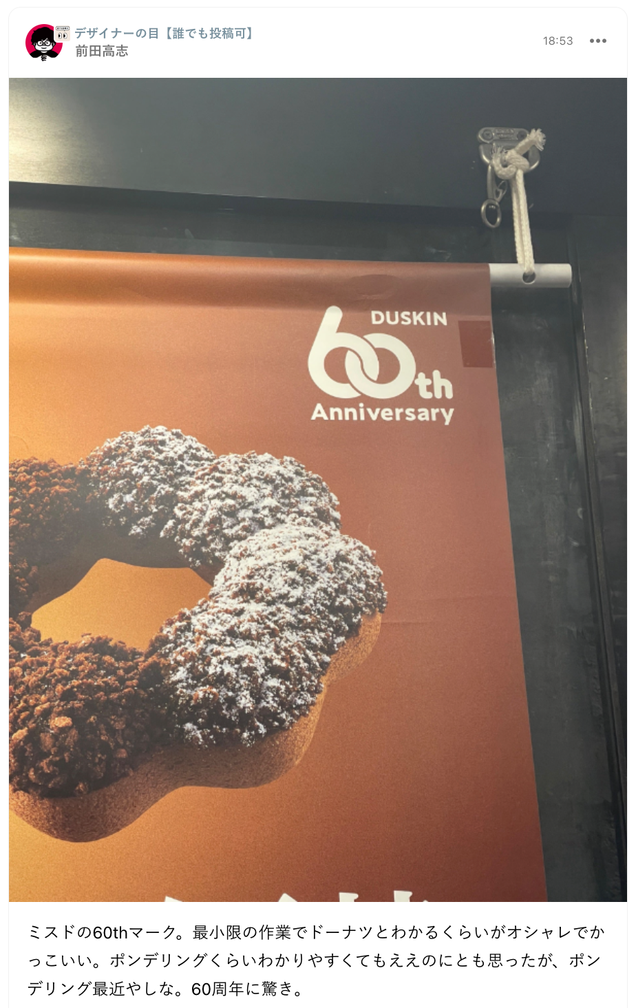 メンバーのみなさんも投稿いただけるようになりました!街中のデザインをどういった視点で見ているのか、みんなでコメントし合い、視点の共有を行なっています。